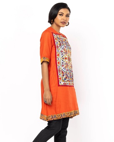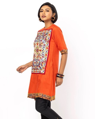 Orange Printed and Embroidered Dobby Textured Viscose Top