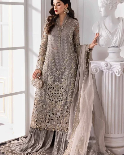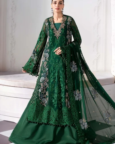 - Embroidered Chiffon Center Panel With 3D Flowers & Luxury Hand Embellishment